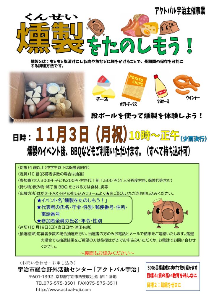 イベント 「燻製(くんせい)をたのしもう!」【NEW】 2025.10.9 【燻製をたのしもう!~申込フォーム】 代表者氏名(漢字) 代表者氏名(ひらがな) 年齢(歳) 性別男女 メールアドレス 郵便番号 住所 電話 キャンセル待ち希望する希望しない ★その他参加者氏名(漢字) その他参加者氏名(ひらがな) 年齢(歳) 性別男女 ★その他参加者氏名(漢字) その他参加者氏名(ひらがな) 年齢(歳) 性別男女 ★その他参加者氏名(漢字) その他参加者氏名(ひらがな) 年齢(歳) 性別男女 ★その他参加者氏名(漢字) その他参加者氏名(ひらがな) 年齢(歳) 性別男女 ★その他参加者氏名(漢字) その他参加者氏名(ひらがな) 年齢(歳) 性別男女 その他、何かございましたらご記入ください。 (任意) Δ 投稿者: admin イベント 「シン・ポテオニ大作戦(畑体験)」【NEW】 前の記事 「そば道場」【NEW】 次の記事