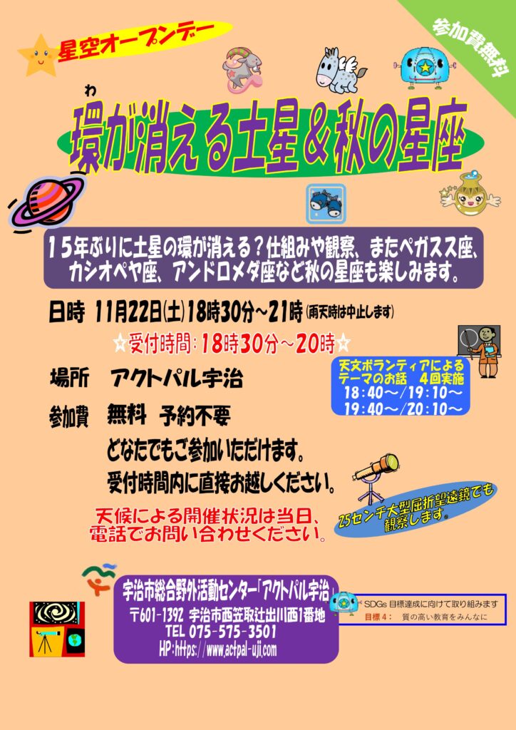 1. 星空オープンデー「環が消える土星&秋の星座」【…