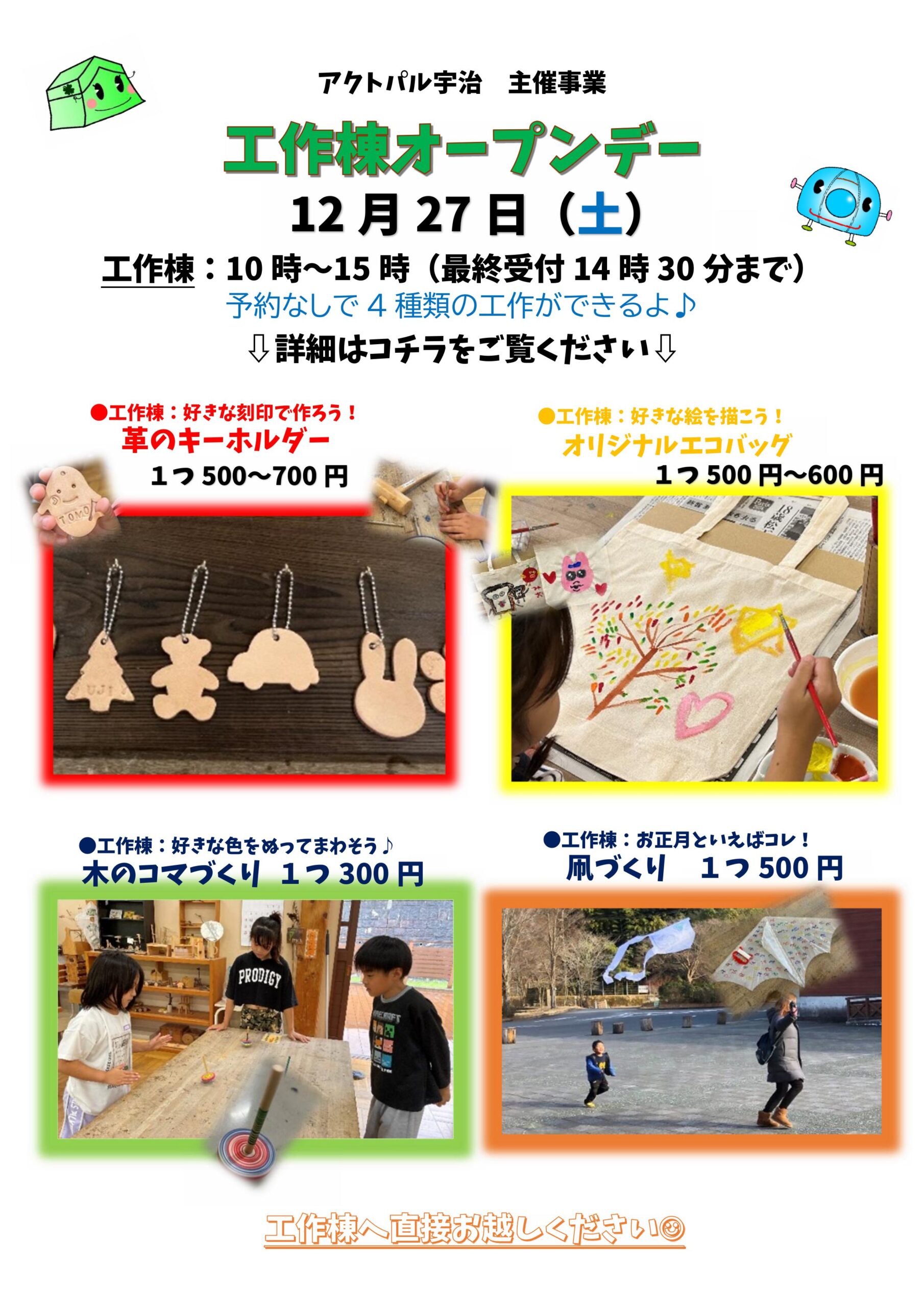 イベント 「工作棟オープンデー」12月27日(土)開催【NEW】 2025.12.14 投稿者: admin イベント 「わいわいホリデー」毎週日祝開催【NEW】 前の記事 「新春笠取市」1月10(土)・11日(日)・12日(月祝) 次の記事