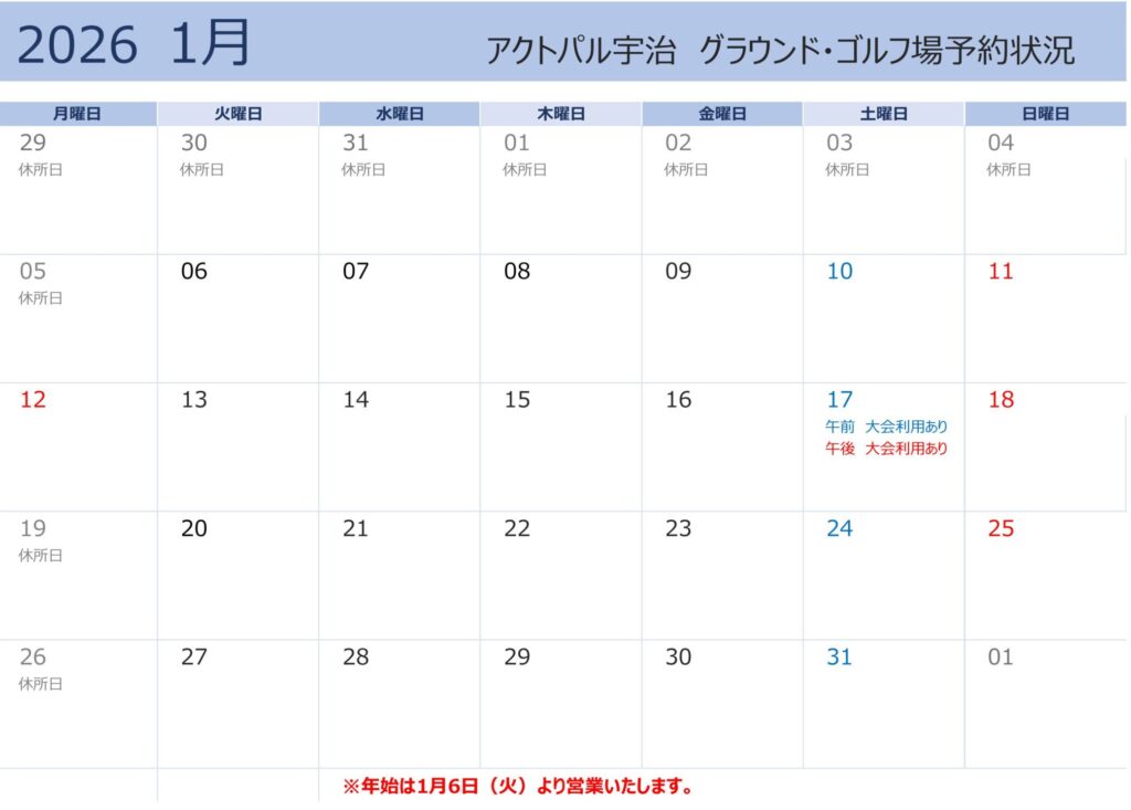 日々のこと グラウンド・ゴルフ場予約状況(1月) 2025.12.26 ※最新の状況はお電話(075-575-3501)でお問い合わせください。 投稿者: admin 日々のこと 「求人のご案内(正規職員)」【NEW】 前の記事 「冬のアウトドアクッキング」【NEW】 次の記事