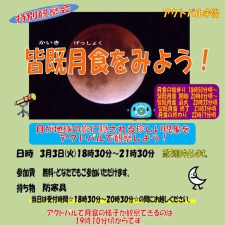 イベント 「工作棟オープンデー」2月14日(土)・15日(日)開催 2026.2.8 投稿者: admin イベント グラウンド・ゴルフ場予約状況(2月)コース更新! 前の記事 特別観察会「皆既月食をみよう!」【NEW】 次の記事