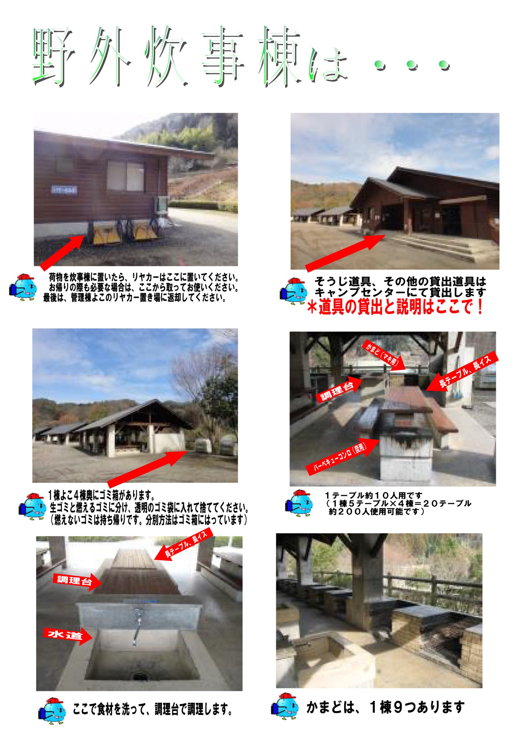 屋根付きの炊事棟が4棟あり、それぞれにかまど、調理台、水道、食事台が付属しており、200名まで同時に使用できます。